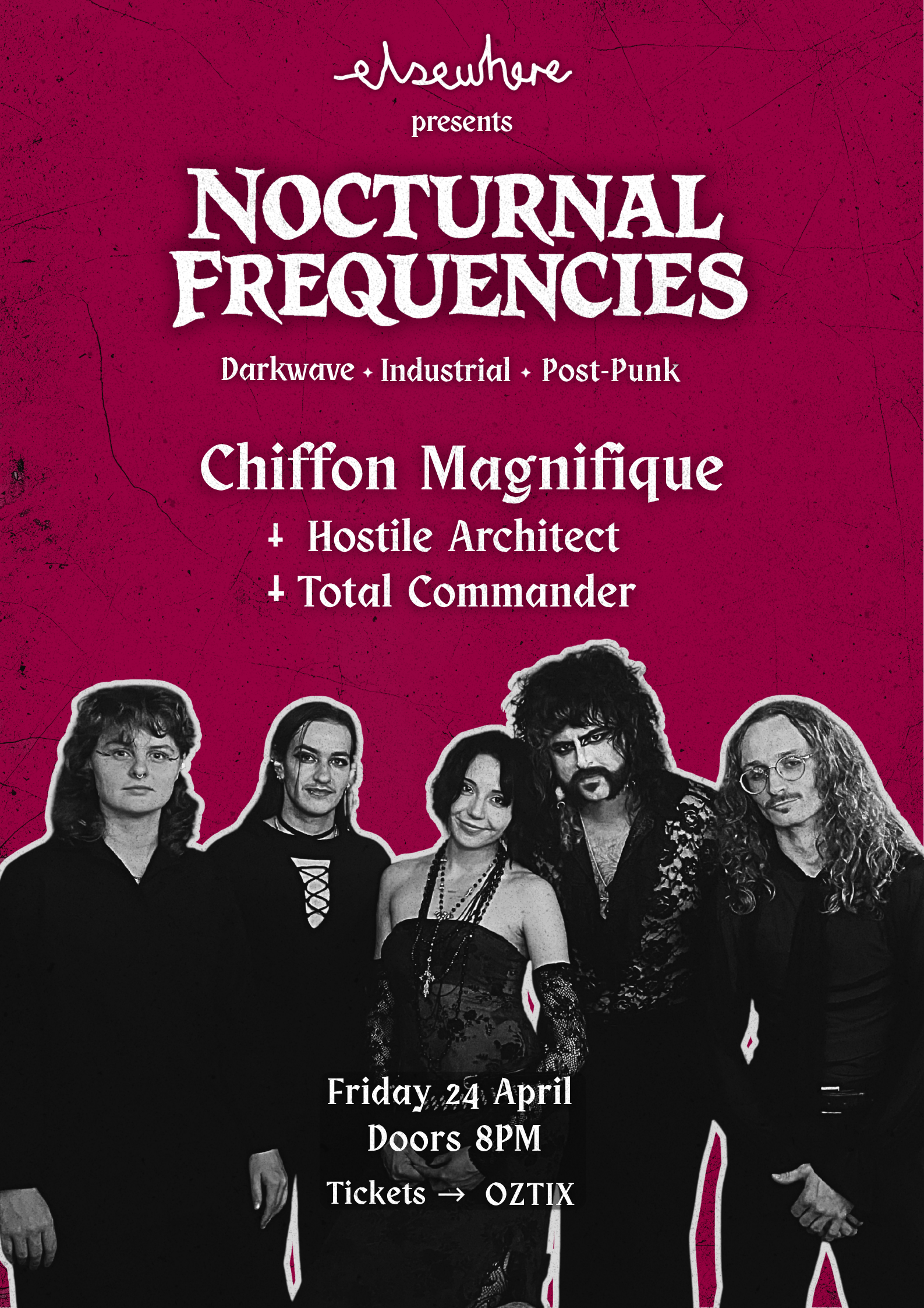 step into the shadows at Elsewhere from 8PM as Chiffon Magnifique unveils an expanded live ritual — now a full five-piece band. Expect drums, bass, saxophone, guitar, and synth woven together beneath layered vocals, transforming the project’s dark electronic core into something far more visceral and immersive. The set will traverse selections from the 2024 debut album Anxietika, alongside fresh, unreleased material emerging from the void.