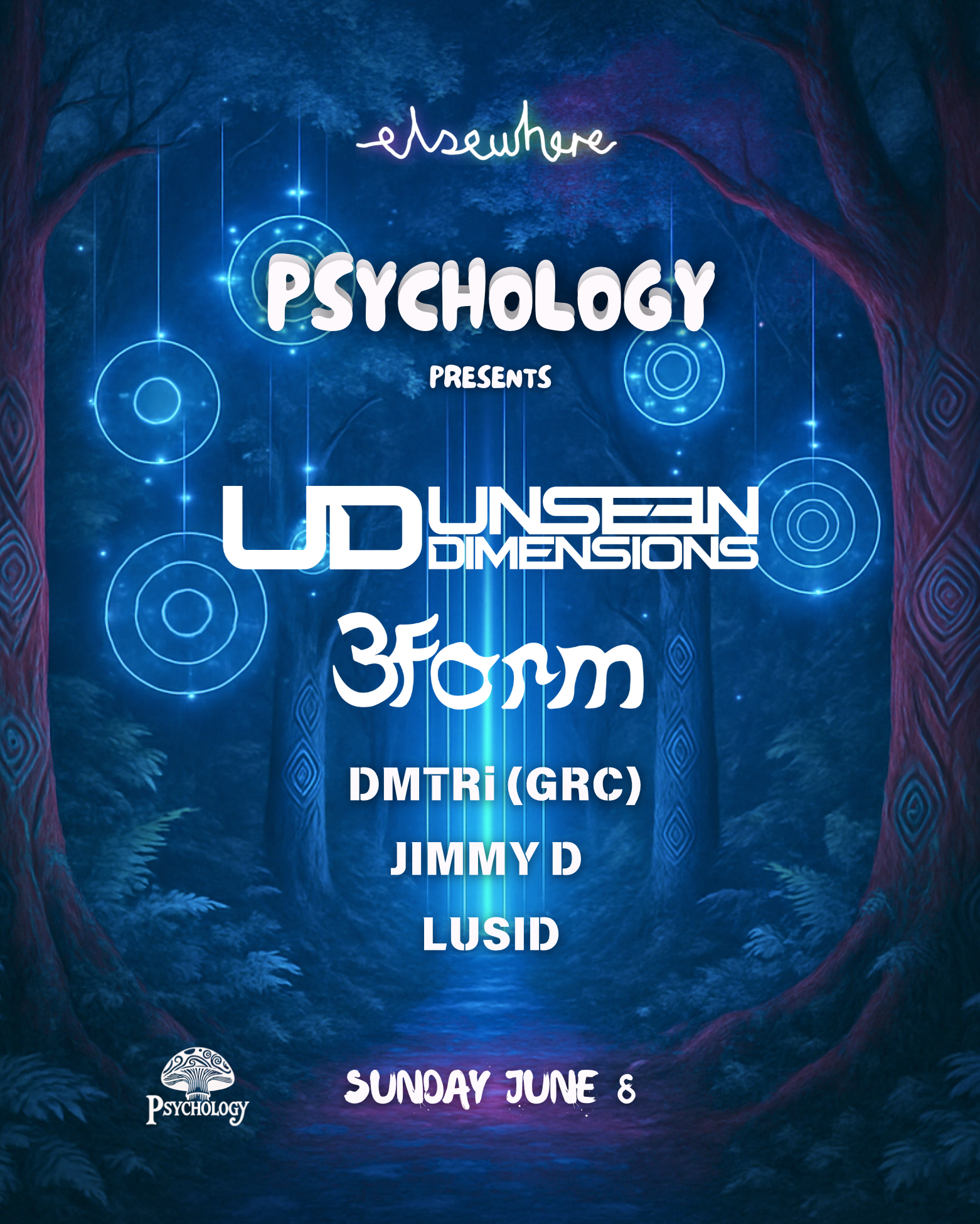 Psychology presents a festival-style line up at Elsewhere nightclub on the Gold Coast. Feat UNSEEN DIMENSIONS, 3FORM, DMTRi & JIMMY D. This is Psy-Trance event featuring Doof decorations by Tight Lines Rigging Shades, market stalls and more.